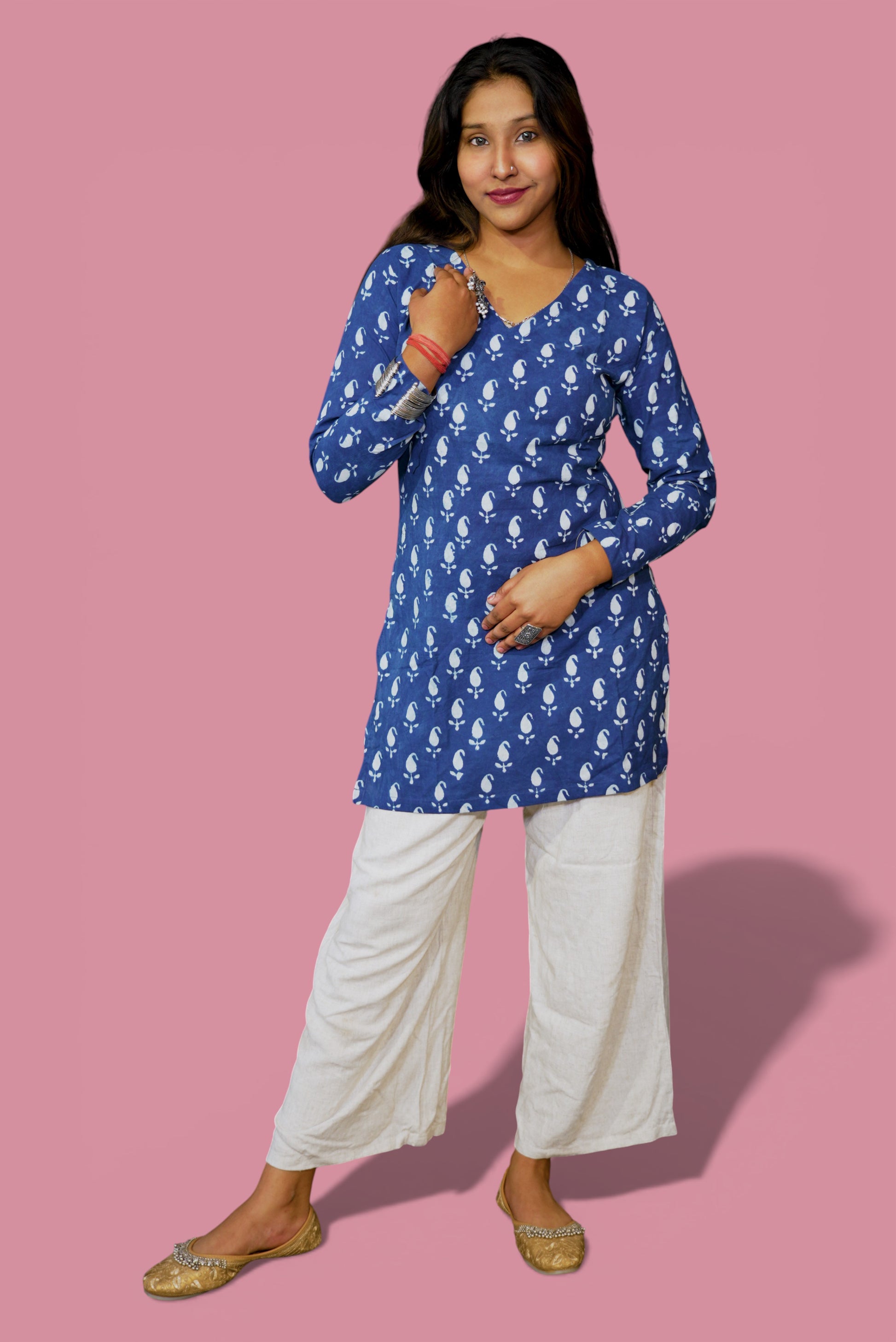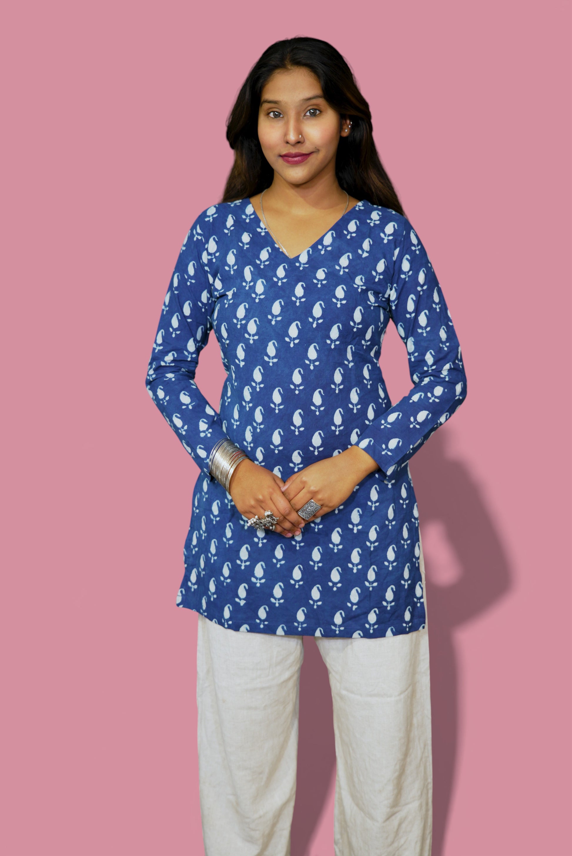 Rooted in hand block tradition with a calm indigo palette, the Vyanmi Inka Indigo Paisley Sleeved Corset Kurti brings effortless charm to a modern corset silhouette. The delicate paisley-inspired block motifs add a subtle, artisanal rhythm, while the corset-style waist gently shapes without feeling restrictive. Finished with easy long sleeves and a breathable cotton base, this kurti is made for everyday dressing that feels light, balanced, and thoughtfully styled.