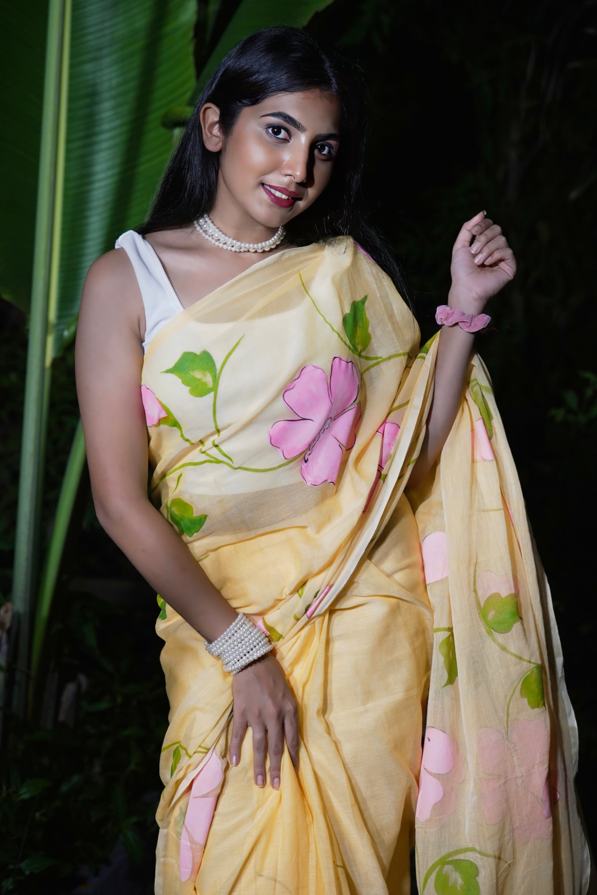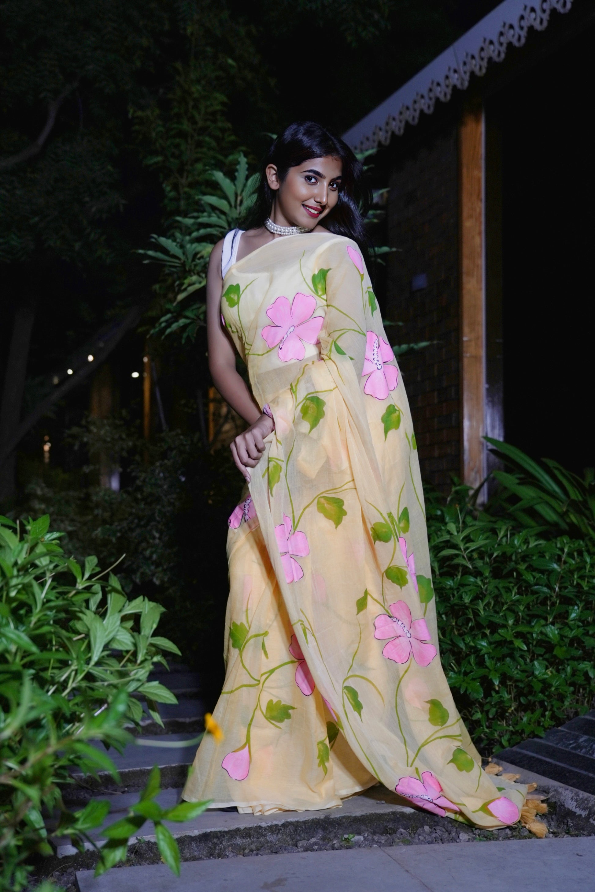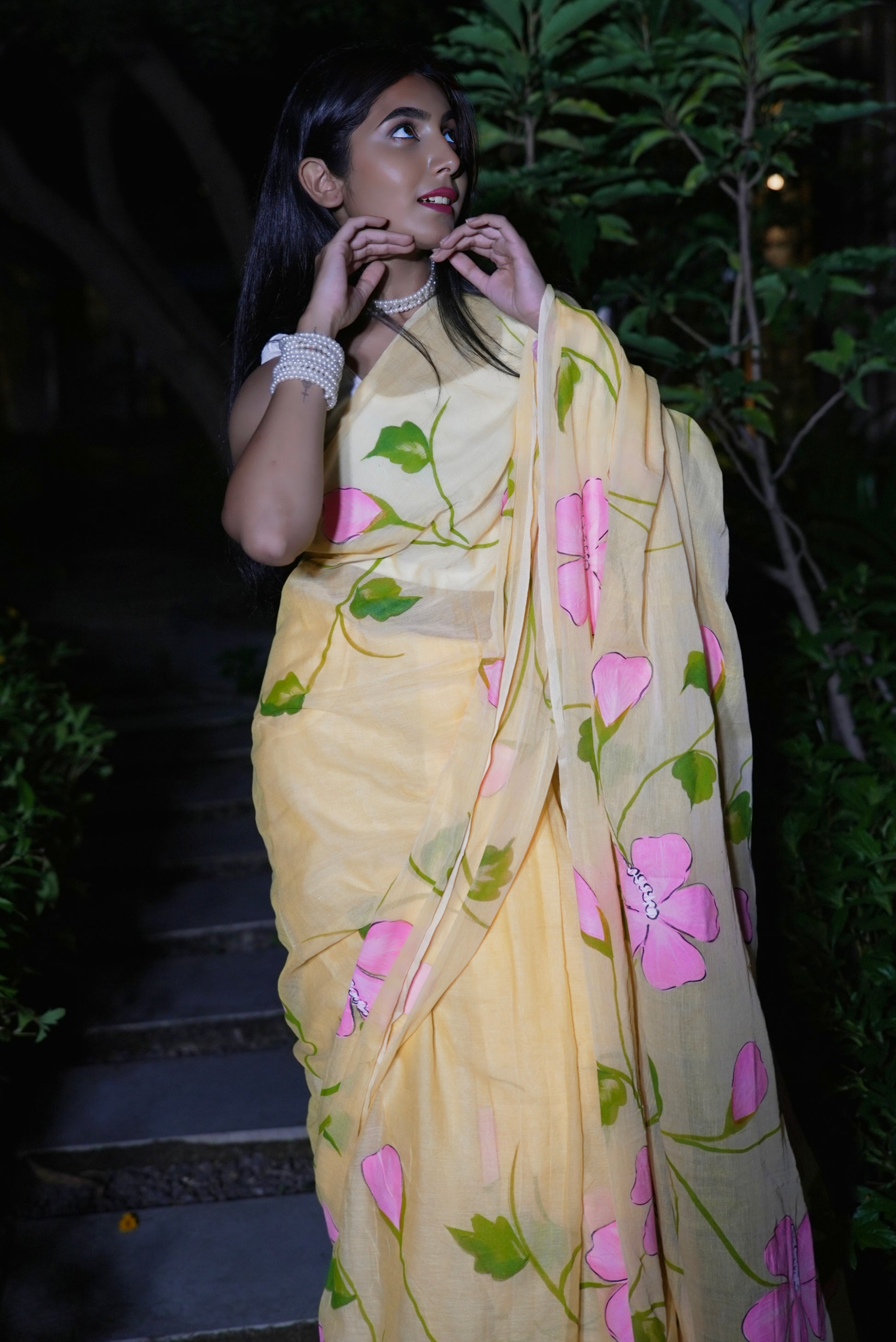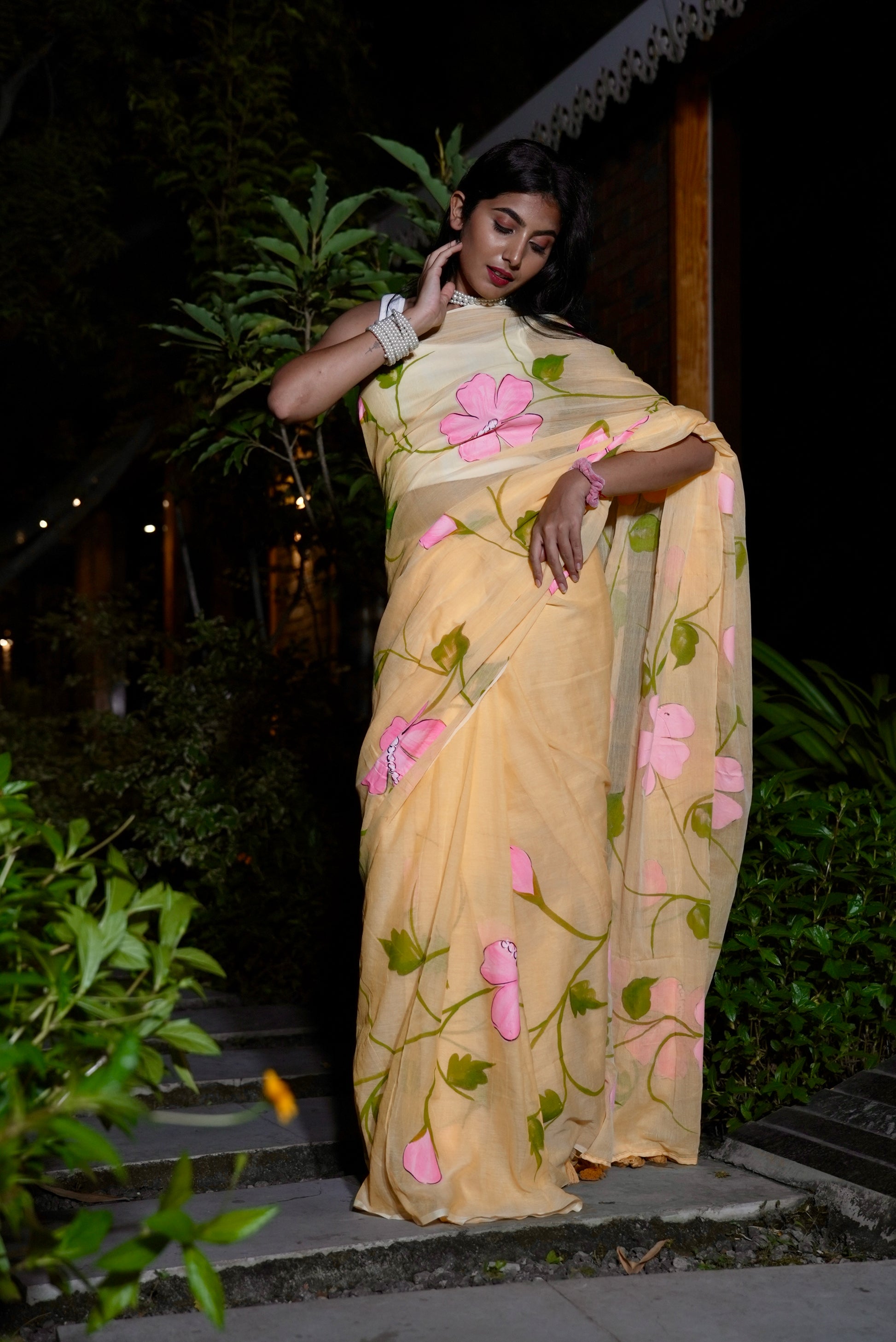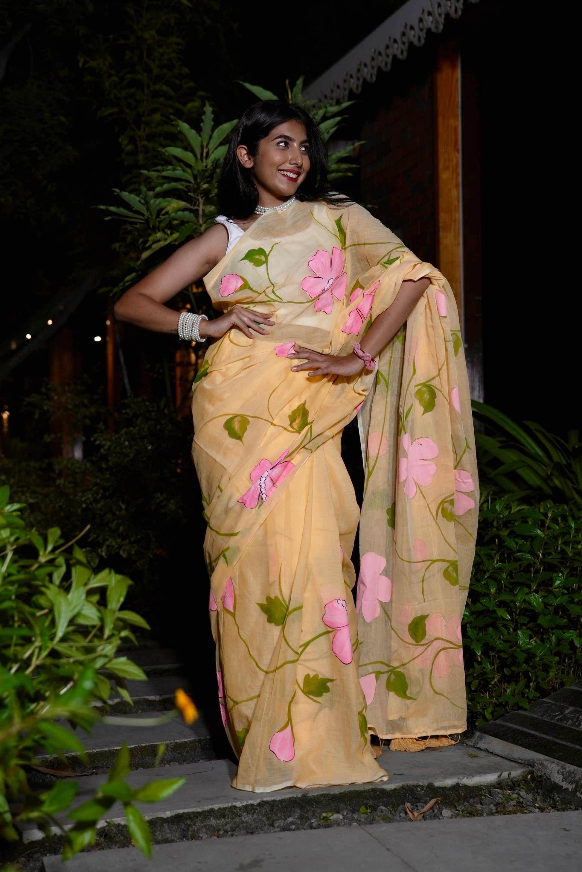 The standout feature? A lively hand-painted floral design, delicately brushed in cheerful hues of pink and green over a vibrant yellow canvas. Every stroke adds a personal touch, making each saree one-of-a-kind. Finished with beige tassels for a playful twist, this drape is equal parts fun and feminine — perfect for brunches, day-outs, or whenever you’re in the mood to glow.